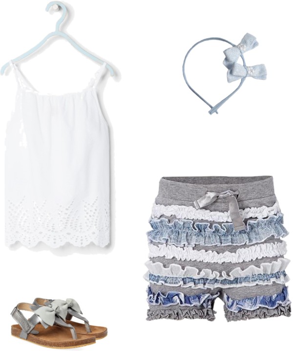 Van dit setje word ik zelf razend enthousiast. Wellicht een beetje teveel van het goede maar who cares, dit mag gezien worden. Good job Replay, deze short met ruffles in kant, denim en stof. Leuk ook, dat de short zowel in baby, kleuter en tienermaat verkrijgbaar is. Logisch, want of je deze outfit of the day nu bij een 1, 6 of 10 jarige aan doet, het is gewoon leuk en met een denim blouse, maillot en laarsjes kan het andere seizoenen ook nog mee. Singlet met broderie voor nu, want als we de meisje meisje kant dan toch benadrukken dan is dit weer zo een puntje op dat I’tje. Bij een meisje meisje look horen strikken, die dan in de vorm van deze zilver met grijze sandalen van Clic! Handgemaakte diadeem in het haar en dit setje is he-le-maal af. Doet u maar twee keer!