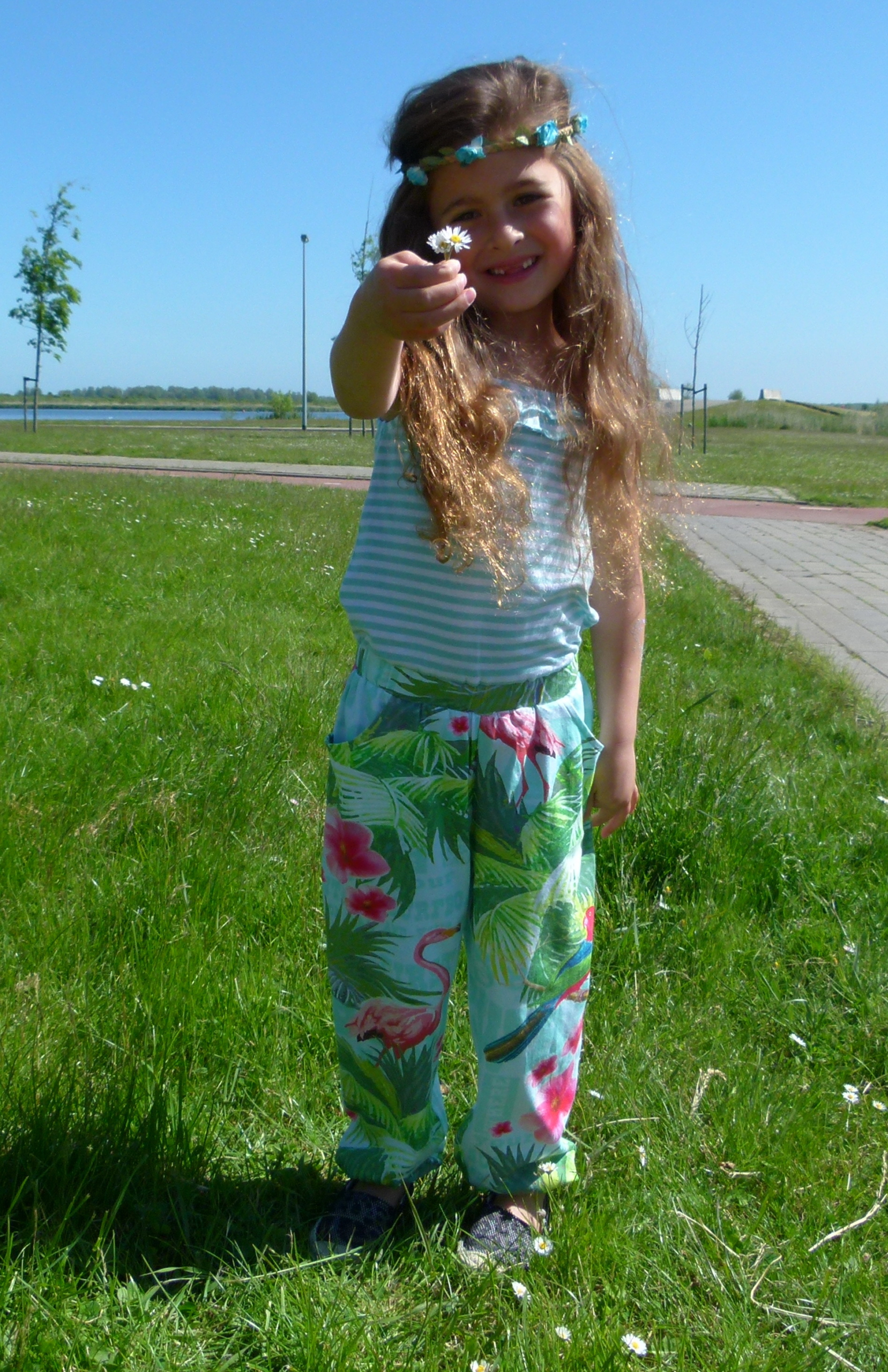Een tropisch plaatje, Esmée in de Totty jumpsuit van Room Seven. Deze hoort dan ook zeker op de mee op vakantie lijst, want iedereen met een hartje voor trends en mode is op dit moment in de ban van palmbomen, tropische vruchten en die mooie roze pelikaan. En laat een combi van deze afbeeldingen en bijhorende kleuren nu een ideale mix en match zijn in de garderobe van onze mini’s. De Totty jumpsuit is dus ook zo een item, rijk aan kleur, print en subtiel ruche maar daar bovenop praktisch, schattig, fleurig, comfy en zó ontzettend leuk! De print is ook nog eens uniek en heeft een lichte stretch. Verkrijgbaar vanaf maat 104 tot en met maat 152. Je shopt Room Seven hier en met 25% korting, dat ook nog eens.