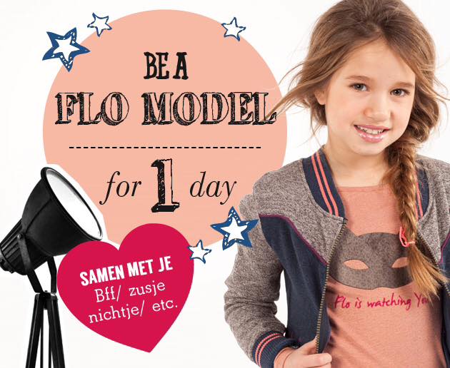Hoe leuk is dit?! Jouw dochter, samen met haar BFF (of vriendje, neefje, nichtje, buurjongetje, buurmeisje etc) als VIP aanwezig, bij de fotoshoot van Flo, op zaterdag 20 juni. Beide krijgen daar een preview van de nieuwste collectie, worden gestyled en gaan op de foto in de Flo studio, bij de professionele Flo fotograaf. Maar het wordt nog leuker! Na afloop mogen ze namelijk een FLO ZOMER OUTFIT 2015 uitkiezen, die ze mee naar huis mogen nemen! En dat is nog niet alles, ze krijgen de professionele foto’s digitaal en wie weet worden de  foto’s gebruikt voor het agentboek. Echte Flo modellen dus!