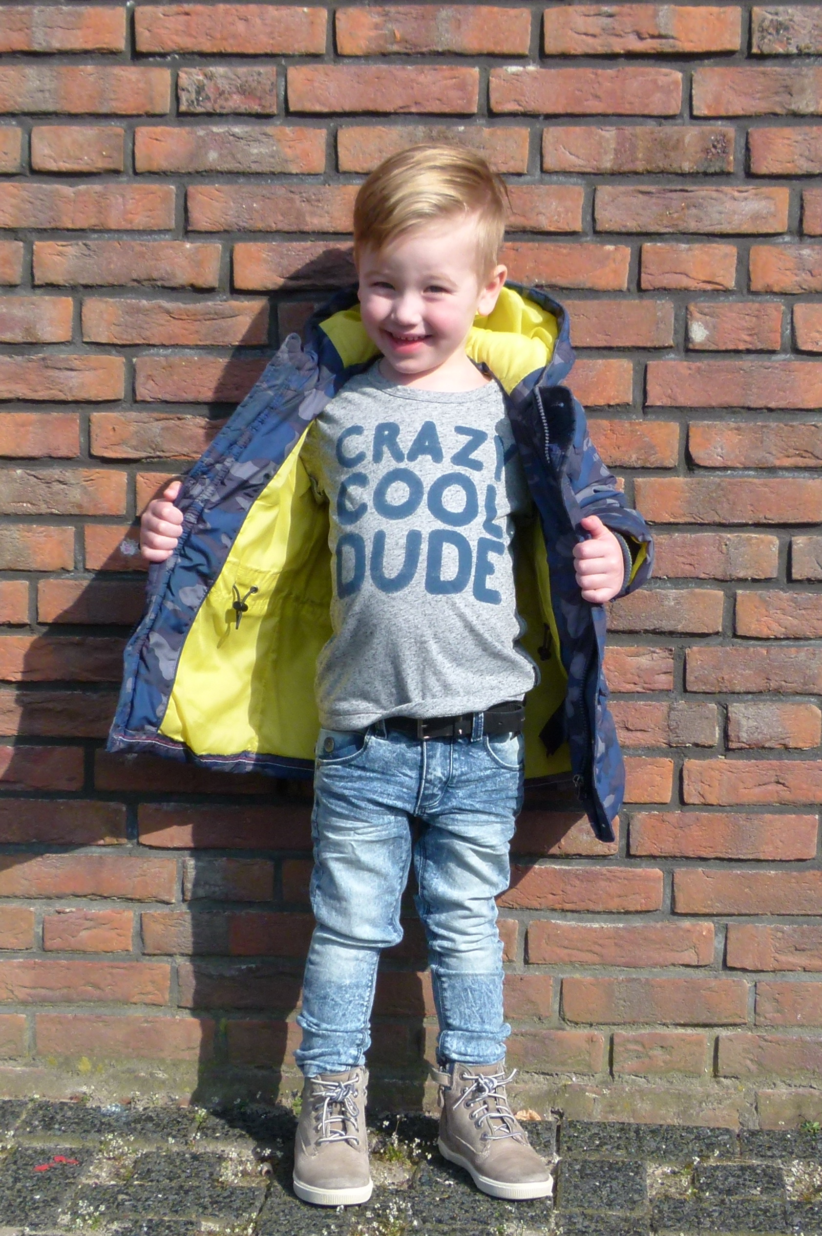 Deze mini dude draagt de crazy cool dude tee van Tumble ‘N Dry , die er overigens ook in grijze sweater variant is. Skinny fit jeans van bleached denim, die gewoon al vanaf maat 68 verkrijgbaar is! Mooie wassing en perfect om nu al te dragen zo richting voorjaar. Dus mocht je nog een goede jeans zoeken voor de kleine man in huis, een TnD jeans zit niet alleen prachtig, maar is ook betaalbaar. Mooie grijze Timberlands enkelboots, die straks ook weer onder een short kunnen. En voor nu toch nog een keer met winterjas ( Tommy Hilfiger ).