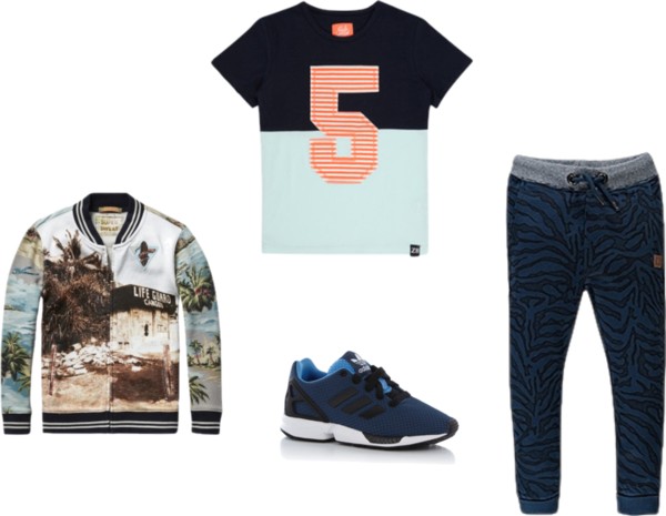 Outfit of the day, Boy Blue. Want wat is mooier dan blauw, toch jongens?! En als het dan ook nog eens lekker zit en de mama’s even diep adem halen omdat hun jongen er weer uit ziet om op te eten, is het helemaal goed. Hoe vinden jullie de Amir pants van Tumble ’n Dry met zwarte tijger print? Weer een item met een animal print voor jongens. Leuk! De allover print bomber van Scotch heeft geen tekst of uitleg nodig. Wat een killer piece! En dan weer wat minder print maar wel blauw met blauw, de Z8 Marlon Tee met cijfer applicatie. En tot slot de Adidas sneakers in zelfde kleuren contex als de pants.