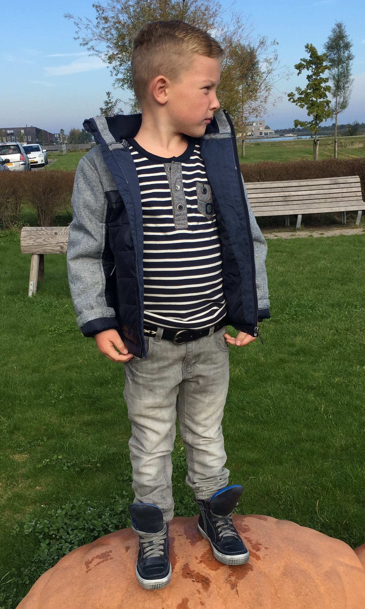 Steal the look en ga voor trendy grijs met blauw. Musthave shirt in gestreept dessin ( heb je er zelf al één?), die net even anders dan anders is door het borstzakje en schouderstukken in contraststof. Leuk! Schoenen aan, in stoere combi van leer en suède en onder een slimfit model als deze grijze jeans heel cool. We maken Bas zijn outfit compleet met een winterjas waar je niet over na hoeft te denken, dit is er zo één die meteen een ‘vind ik leuk’ reactie geeft. Met een’stukje’ bomper en ‘stukje’ parka geeft het tweekleurig dessin dit contrast mooi weer. Maar buiten dat, deze jas is warm, winddicht, goed van kleur en dus ideaal voor jongetjes die graag buiten spelen zoals Bas. Lookje stelen? De icoontjes staan hieronder, dus klikken maar.