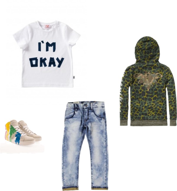 Today I wear…Deze gedurfde Italiaanse sneakers met verfspatten en veloursleren stukken van Jarrett, de Name it boysjeans met accent omslag. En, hoe cool is deze?! De I’m okay tee van Il Gufo. Dan last but not least een hoody van Scotch Shrunk, lekker warm en altijd goed. Fijne woensdag!