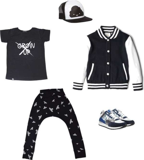 Zwart wit saai? Nee, juist super stoer met de Don’t grow up tekst en all over raaf print op deze baggy pants. Oké, een ietsiepietsie blauw in de sneakers. Maar het hoeft toch niet altijd een outfit vol met kleur te zijn? Een outfit of the day voor rebelse jongens. De baggy pants van Moi Kidz, de ‘Don’t grow up tee‘ van Mini & Maximus en de mega coole Whistle & Flute cap doen eigenlijk hun werk al om er een ondeugende boys style van te maken. De Mango bomber, terug van weggeweest, legt nog even de nadruk op dat mooie zwart wit contrast en juist dat beetje blauw in de Hip sneakers geven even een tegen stootje in het geheel.