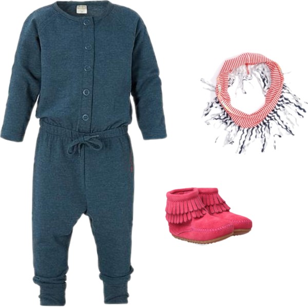 Een jumpsuit voor de allerkleinste van Name it. Zacht, en ook nog eens lekker warm. Een vrolijke tunnelsjaal van het te gekke NONO als accessoire en deze mini Minnetonka’s maken het af. Hoe hip kun je als dreumes zijn.