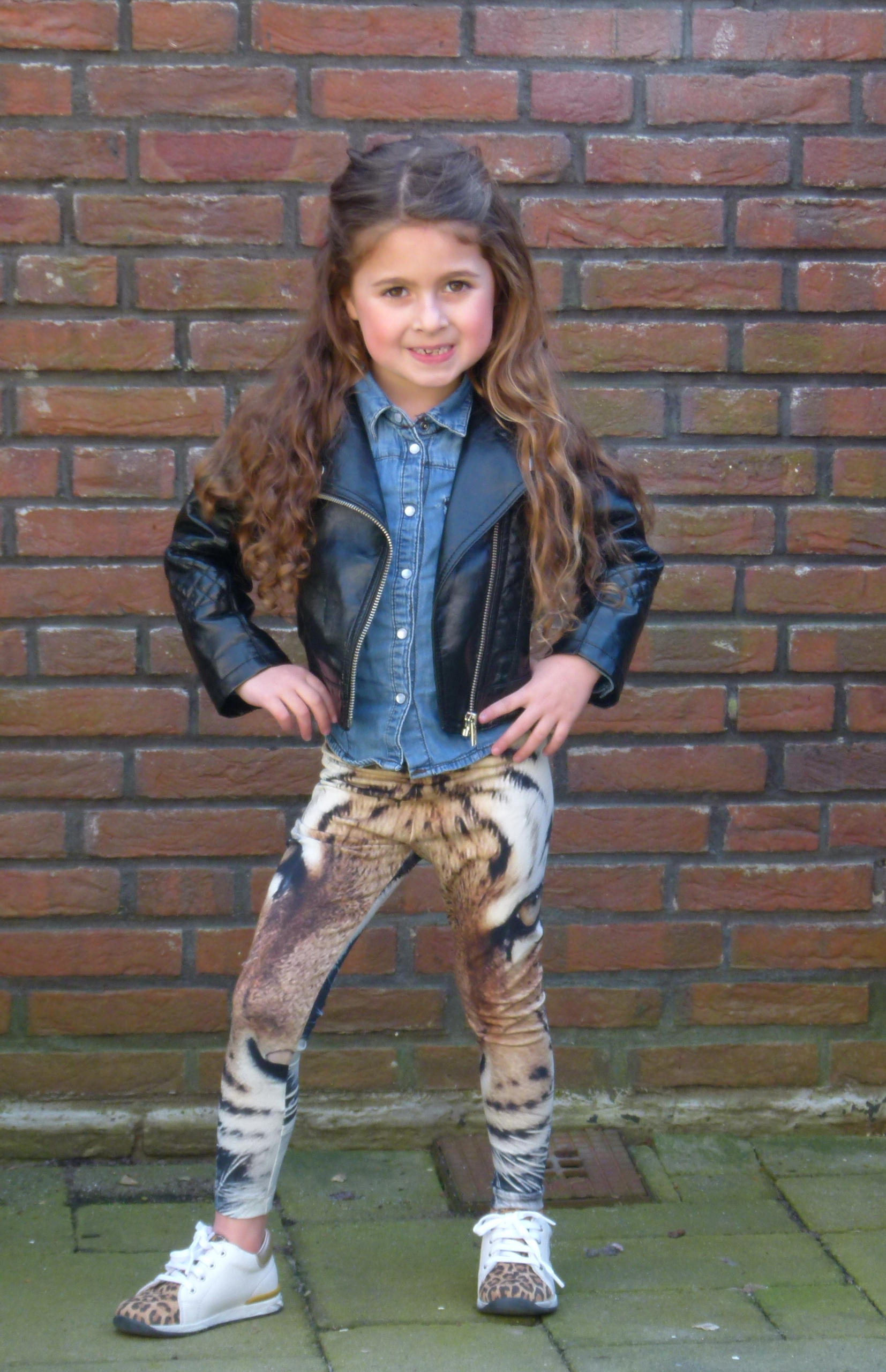 Een van de meest gewilde items van Popupshop, de Tiger legging die samen met de baggy pant variant een wannahave is van menigeen. Met dit juweeltje aan hoef je dan ook niet veel meer te doen qua styling. Esmée draagt de Popupshop broek met een denim blouse van Vingino (sale item by the way) en het biker jasje van Mango Kids. Een effen schoentje zal ook niet saai ogen, maar om juist te laten zien wat je kunt doen bij zo een aanwezig broekje, heb ik de outfit vandaag gecombineerd met witte sneakers van Falcotto Naturino met leopard accent. Een klein beetje over de top is best leuk, toch? Bovendien zijn deze soepele leren sneakertjes niet alleen een lust voor het oog van een modebewuste mama maar ook goed voor groeiende kindervoetjes.