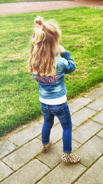 Op één of andere manier word ik er altijd naar toe getrokken, items met een tekst, geen idee waarom maar het lonkt. Met name wit met zwart of zwart met wit, staat er dan ook nog eens iets pakkends op, ben ik verkocht. Het moet dan wel een tekst zijn en geen merk want daar ben ik nou weer niet van, zeg ik met Céline tee als gouden ouwe. Maar daar gaat het nu niet over, genoeg inleiding, waar het op neerkomt, Jolie’s jasjes zijn te klein. Niet zo gek en schaam me dan ook diep, ze liep nog in een bikerjasje maat 92/98 terwijl ze al richting de 110 gaat, hetzelfde verhaal voor haar spijkerjasje. Brengt ons op het volgende punt, mijn liefde voor spijkerjasjes. Helemaal in mini maat en met een ‘dingetje’ die net het het jasje joie de vivre geeft. Je kunt dus wel zeggen dat deze jasjes hun geld inmiddels hebben opgebracht. Bovendien had ik een nieuwe missie, een nieuwe jasje. Nu vind ik de bomber met bloemenprint geweldig maar degene waar mijn oog op viel is er steeds niet in haar maat. Dit vroeg dus om een snelle handeling en wat is er dan onmisbaar in de garderobe van klein tot groot en waar kom ik telkens weer op uit? Precies, een denim jacket want denim is a way of life, stoer, praktisch en nog eens praktisch. Daar hing hij dan, mooi van kleur, wassing én met merk…In dit geval was het argument dan ook zo van de baan, want wij vonden hem prachtig. Dit Vingino jasje én juist de letters stijlde het helemaal af en de kleuren die doen het juist zo leuk. Het jasje met een ‘dingetje’ heeft ook nog eens een rits, dus geen gedoe met peuters, knopen en zelf doen. Zie hier onze nieuwe aanwinst in, ja, een maat 110.