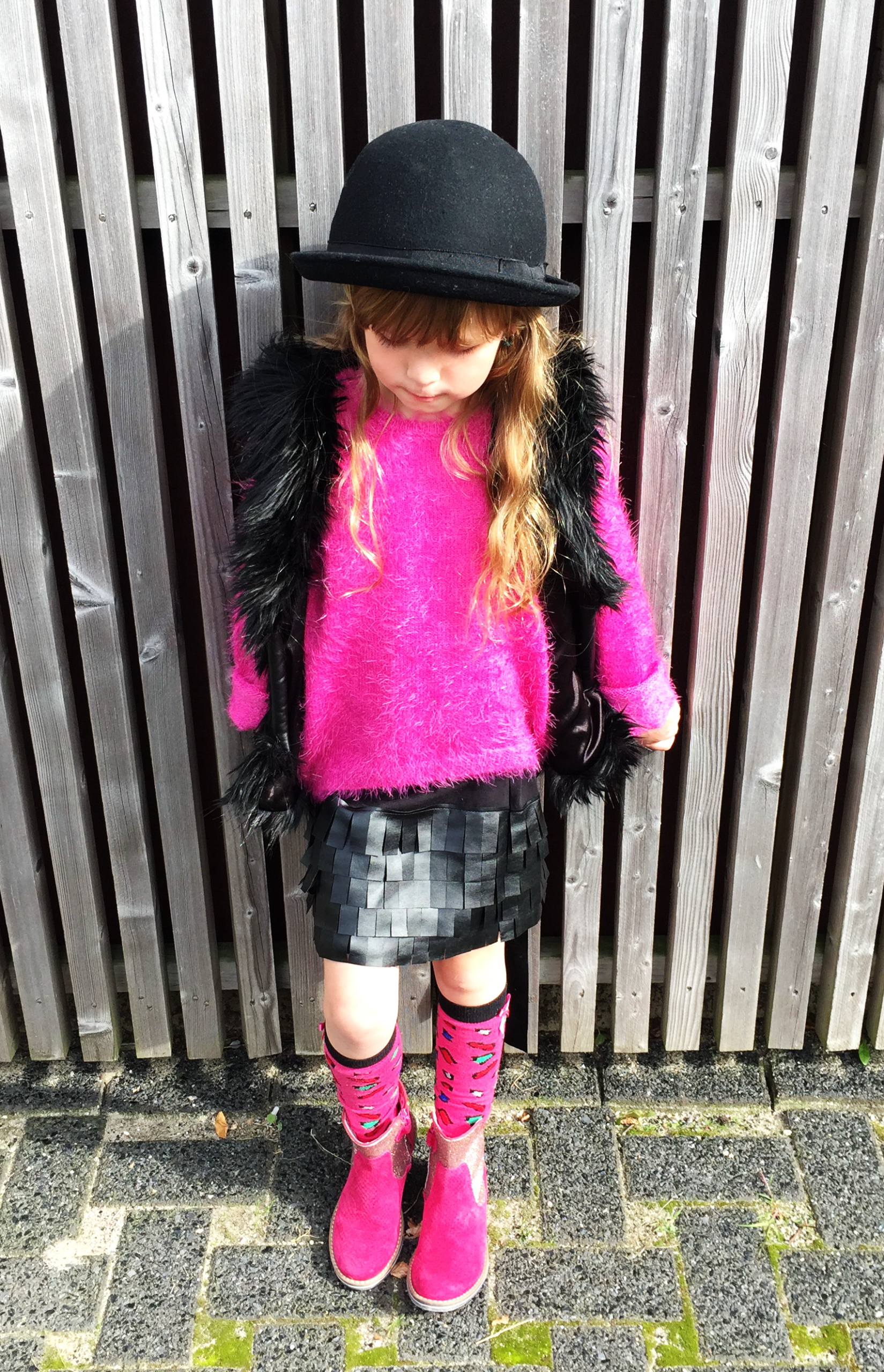 Emma in dé LoFff rok van dit seizoen, in zwart tricot met leather-look franjes is dit zeker een key piece in de herfst winter garderobe. En één die vaak gedragen zal worden, want kleine meisjes en rokjes, is een liefde die er al snel in zit. Gelukkig is het rokje al verkrijgbaar vanaf maat 92. Het was dan ook even kibbelen wie het rokje aan mocht op de foto, een goed teken want de meisjes vonden het rokje allemaal zo mooi. Daar kon ik me helemaal in vinden, dit pracht exemplaartje is er duidelijk geen twaalf in een dozijn en biedt genoeg mogelijkheden qua combineren. Juist dat maakt het voor mij nu extra leuk en is dan ook een standaard gegeven waar ik op let bij het uitkiezen van een item. Zo oogt het iedere keer weer anders en raak je er niet snel op uitgekeken. Verheug mij er nu al op het rokje ook eens met Dr Martens of sneakers te combineren, want het fake leather maakt het rokje toch ook ietwat stoer. Zo hoef je niet alleen in laarsjes te denken en in dit geval kun je helemaal los gaan met maillots, kniekousen of een coated legging voor iedere keer een ander lookje. De pasvorm is ook een belangrijk punt waar goed over is nagedacht. Bij zowel een smal als stevig meisje valt het rokje goed om het lichaam, zonder te strak, te kort of lijzig te ogen. Geen nadelen kunnen vinden dus, want zelfs na een middagje springkussen is er nog geen franje verloren gegaan. Status key piece op alle fronten dus. Het LoFff fringes rokje koop je online onder andere hier