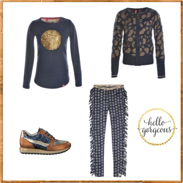 Furry meets bohemian en blauw meets goud. Deze outfit is zo ons! Items met print en franjes en wij zijn verkocht. Ook wel een hele mooie dit, de legging met franjes van R’Belle. Een outfit in keurig matching colours maar wel spannend door de diverse stoffen, prints en dragen in lagen. Want een vest als bovenlaag is toch wel het perfecte herfst item, zoals deze van Like Flo, in blauw met brons. Primabase sneakers eronder met dito kleuren en cool craquelé, al een lust voor het oog op zich. Is deze look ook helemaal ‘jullie’? Dan kun je deze outfit shoppen via de linkjes of onderstaande icoontjes.