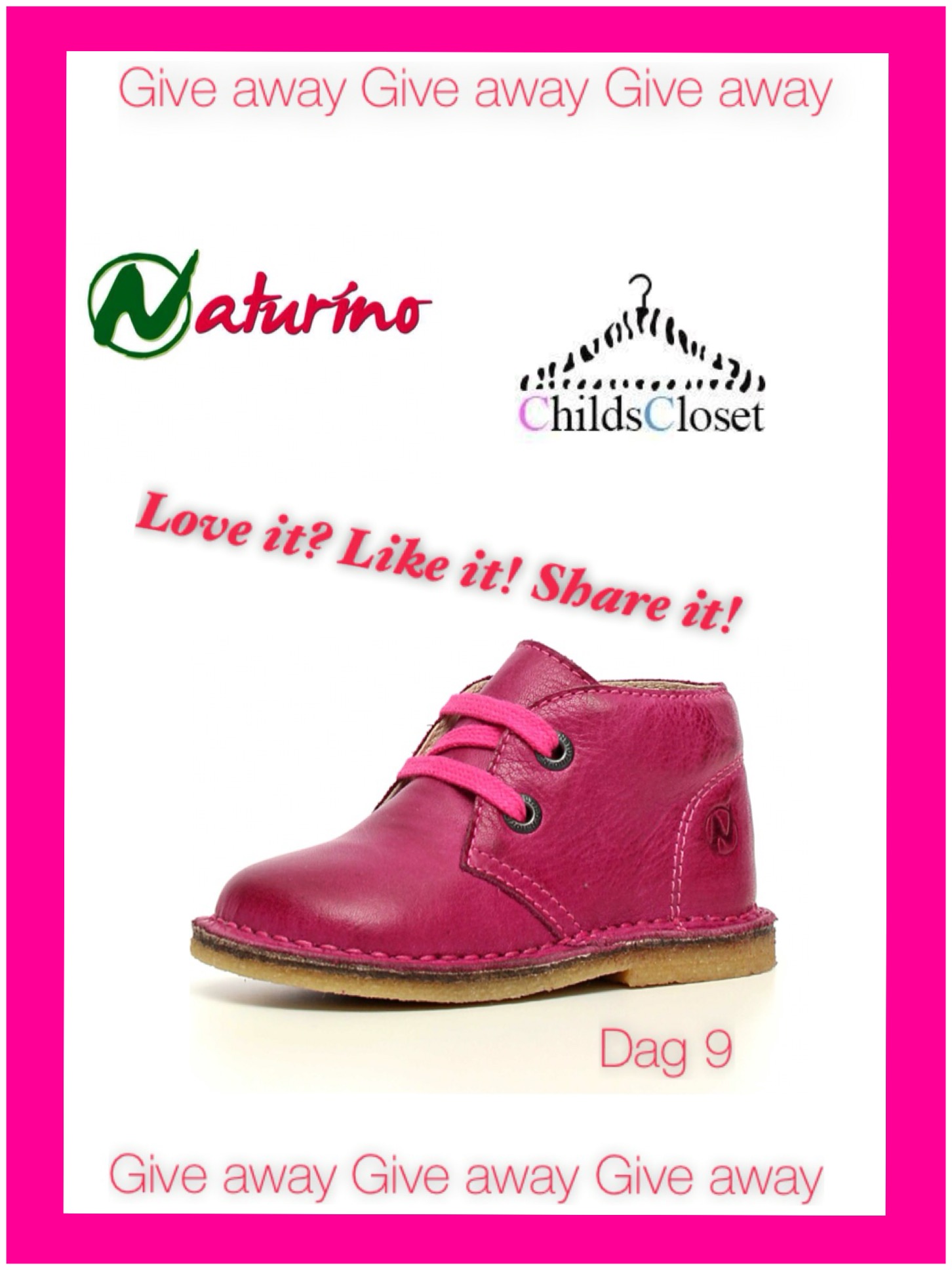 Een paar super coole desert boots van Naturino mogen tijdens deze give away weken gewoon niet ontbreken. Stoer onder een jeans, lief onder een jurkje en echte eyecatchers in deze frisse fuchsia kleur. Bovendien niet de minste schoentjes om aan je voeten te dragen, want Naturino staat al jaren bekend om de goede kwaliteit en pasvorm voor kindervoetjes in de groei. Deze juweeltjes aan de voeten van jouw kindje, nichtje, kleinkind, buurmeisje of vriendin? Zo maak je kans.. Als je al vrienden bent met ChildsCloset like dan ook de Facebook pagina van Naturino en deel dit bericht zichtbaar op je tijdlijn. Nog geen vrienden van ChildsCloset op Facebook? Nog even doen want every gift from a friend is a wish for your happiness. En… vergeet de maat niet door te geven in een reactie onder dit bericht op Facebook. Meer Naturino zien? Ga dan naar Naturino.com