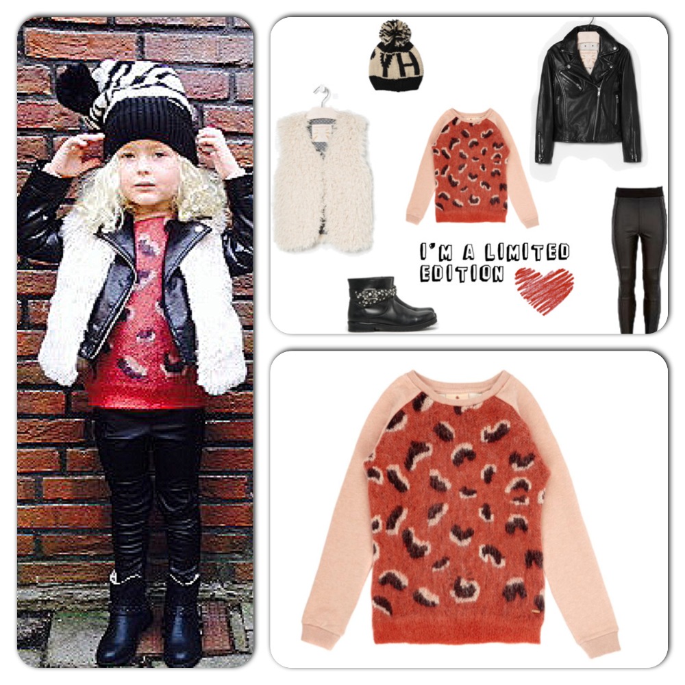 Daar is weer zo een juweeltje van een Scotch R’Belle trui, gedragen door kleine bikergirl Pien inclusief River Island bikerpants, Mango bikerjacket en motor booties. Door de bonten bodywarmer over de biker jas te dragen kun je dit jasje voorlopig nog even doordragen. Shop je favoriete item via onderstaande icoontjes. De trui is vandaag gunstig geprijsd…