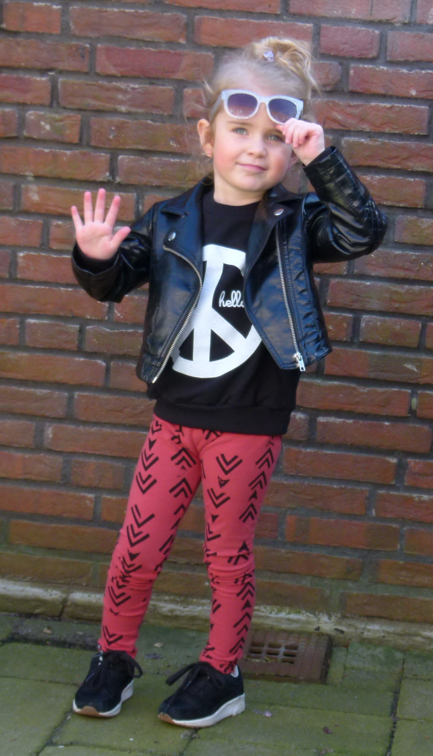 Heerlijk dit weer maar bij mij vaak wel een dilemma ’s ochtends, voor de kleding kast van Jolie. Ik kies nu dan ook regelmatig voor een legging met afbeelding of print gecombineerd met een stoere sweater. Zit haar goed, beweegt fijn en het staat haar samen met haar leren bikerjasje lekker eigenwijs. Bovendien is het bikerjasje in dit weer ideaal. Het zit niet te warm en niet te koud tijdens het spelen. Vandaag dan ook de Arrows legging van Mini & Maximus, nu trouwens zeer gunstig qua prijs. De Peace Raglan sweater is van Hello Apparel, die haar niet alleen geweldig staat, wij dragen ze zelf ook graag.