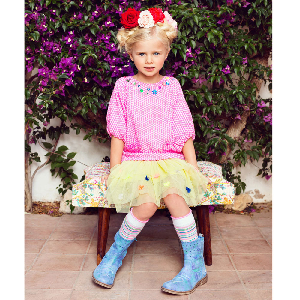 En hier kijk ik nu twee keer per jaar naar uit, benieuwd wat Mim-Pi ons gaat brengen. Na een kleurrijke prachtige felle winter collectie slaan we linksaf naar de candystore, door het gebruik van weer een heel ander palet aan kleur. Mintgroen, babyblauw en andere trendy pastels passeren de revue, kenmerkend door items in soepel vallende joggingstoffen die ondanks deze sporty touch, op en top meisje zijn door subtiel te werken met fijne studs en strass. Hier word je gewoon ‘happy’ van want er is nog meer, zoals we van Mim-Pi gewend zijn. Pretty, zoals ieder meisje zich wilt voelen, maar vooral hoort te voelen, een dress up, maar in je eigen kleine meisje stijl met de liefste rokjes, blouses en kniekousen. Tie-dye Blues, de perfecte vertaling van de bohemièn hippie style naar een kinderlijke manier, do I need to say more? En last but not least, Yoga, prachtige Indiase borduursels en fluor kwastjes, in een woord: Ibiza. Mim-Pi, kleurig, hip, dromerig, absoluut niet burgerlijk maar verassend en trendsettend. Mim-Pi, jij maakt ons happy!