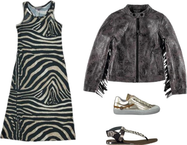 Pats, boem, verliefd! Dit leren ’tussendoor’ jasje van Baker Bridge is toch wel zo stoer met de fringes aan de mouwen! Die gaat op de wishlist en wel meteen. En als we het dan toch over stoer hebben, de Geisha maxi jurk doet er niet voor onder. Die er trouwens ook in mama maat is. Wat is deze print toch prachtig! Nu nog even in de kast, maar over een maandje kan de jurk vast al prima aan, met een vest en de gouden metallic sneakers van Shoes Me. Maar als het zonnetje dan echt zijn werk gaat doen, zijn de Gioseppo sandalen een super aanwinst onder deze jurk en voor de voetjes.