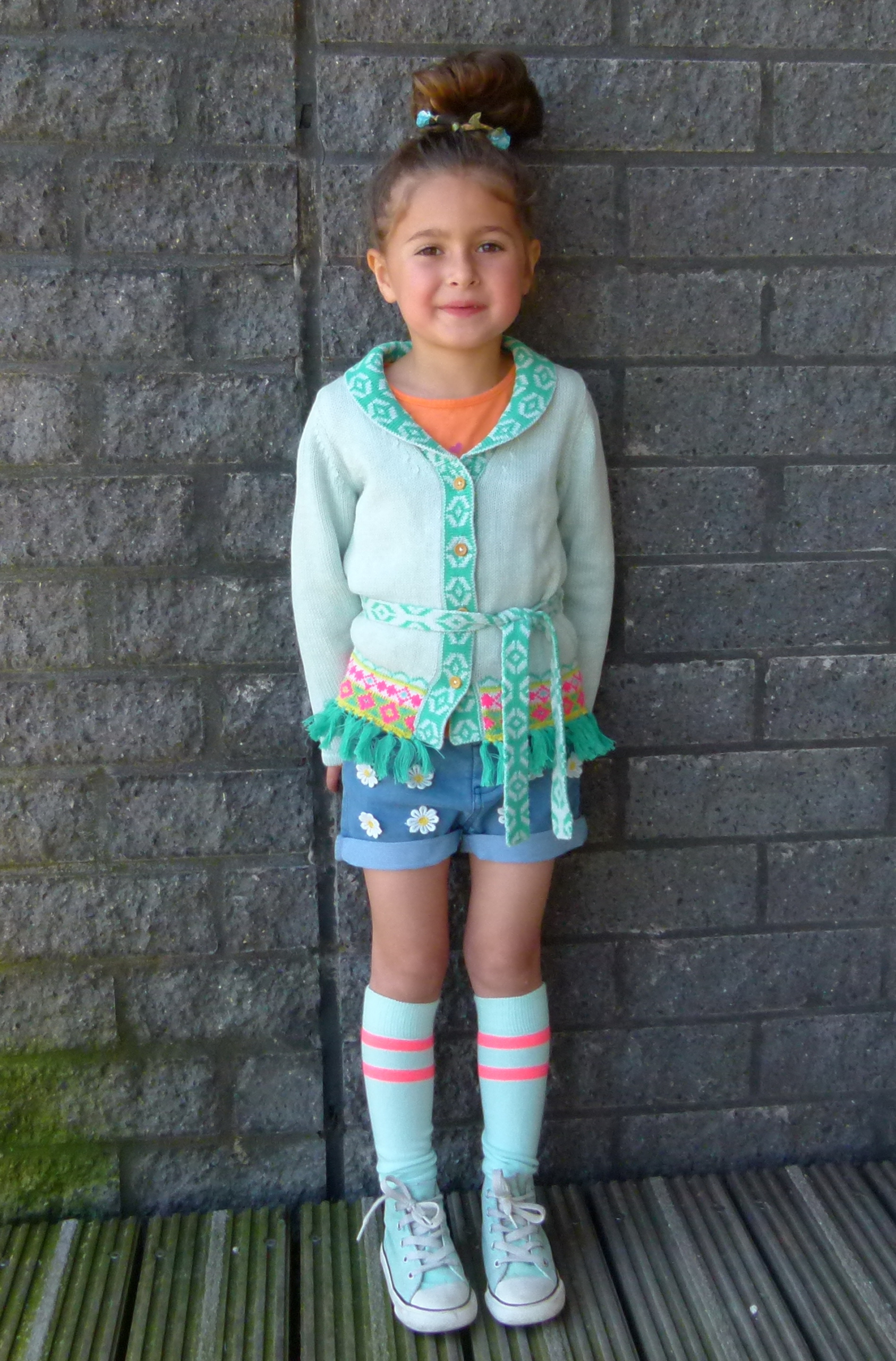 De perfecte outfit om op schoolreisje te gaan of een dagje er op uit met het gezin. Een fleurig vest van Room Seven die je print op print combineert of juist met effen items. Genoeg keus door de hoeveelheid vrolijke kleuren en lekker opvallend ook, raak je je kindje ook niet snel uit het oog tijdens zo een uitje, bovendien perfect te dragen op dagen als deze in plaats van een jas. Denim short van de Primark met lieve madeliefjes is van een zachte stretchstof dus uitstekend om in te klimmen en klauteren. Kniekousen van Z8 mocht het geen sandaaltjes weer zijn, want de kniekousen hoeven natuurlijk niet alleen bij de bijpassende jurkjes gedragen te worden. Een paar classics tot slot, de Converse Allstars en Esmée kan op pad. Deze outfit shoppen? Via de links en onderstaande icoontjes kom je bij de verkopende online shops.