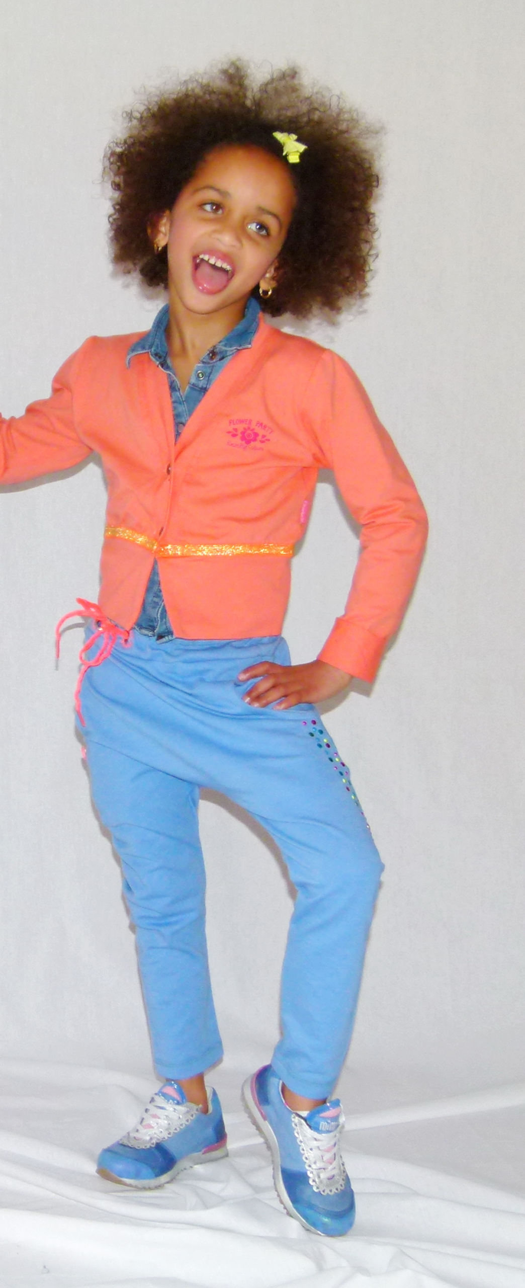 De baggypants heeft een sportieve look maar wel met een chique twist, door de studs en strass op de bies van deze coole comfy fit broek. Sporty chic dus de look van vandaag! Leuk contrast niet, het meloen oranje vestje van Kiezeltje met het korenblauw? De Mimpi sneakers voor net die extra nadruk in deze outfit of the day. Maar ook met een enkellaarsje zou deze outfit hartstikke leuk zijn en weer een hele andere draai aan het geheel geven.