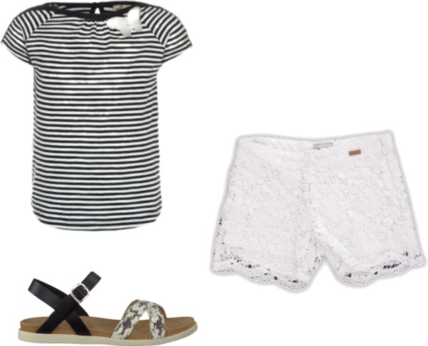 Was de kanten short verleden jaar een veel gezien item op de festivals, deze zomer is deze trend ook veel te zien bij de kleinere maatjes. Leuk! Heel leuk! Want kant oogt lief, romantisch en toch ook wat klassiek. Helemaal als je een kanten short combineert met een nautisch shirt, zoals in dit geval. Het zilveren vlindertje doet er nog even een schepje bovenop. Poppig niet? De zwarte sandaal met leren bandjes heeft een subtiele slangenprint, niet te aanwezig en makkelijk te combineren met andere items. Klaar, compleet, een nieuwe frisse outfit is weer een feit, stylish voor de dag met kant.