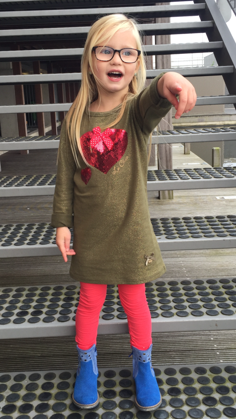 Le Chic, het ultieme meisjesmerk dat alle facetten bevat die rond gaan in de fantasie van kleine chique dametjes. Met de gedachten toch al een beetje richting de feestdagen, laat ik jullie de komende periode dan ook graag wat items zien die zowel voor, als tijdens de feestdagen goed tot zijn recht komen. In dit rijtje kan en mag Le Chic dan ook niet ontbreken. Isa draagt vandaag niet alleen een casual maar ook chic jurkje, weliswaar in stoer army maar met een lichte sparkle en afgemaakt met lovertjes in de vorm van hartjes als opdruk. Een combi stoer én strikken dus! Met een mooie roze, rode legging waarvan de uiteinden van de pijpen een elastisch rimpel-effect hebben en als ultiem Le Chic detail versierd zijn met “strass”-steentjes kan ik niet anders zeggen, dan dat dit een heerlijk comfy setje is met feestelijke allures. Meer over de top tijdens de feestdagen? Combineer het jurkje dan met een fake fur gilet en één van de vele maillots met print, strikjes en zelfs all over strass steentjes uit de Le Chic collectie. Deze outfit shoppen of meer Le Chic zien? Klik hier of hier of ga voor verdere verkoop informatie naar www.lechicfashion.eu