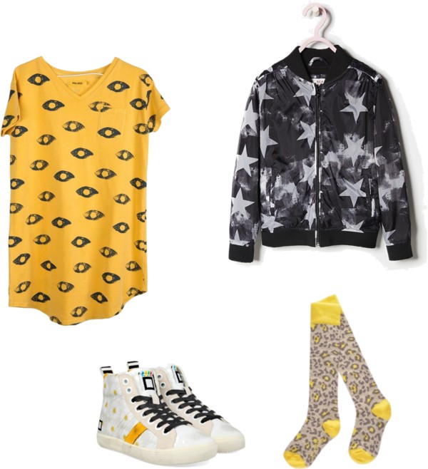 Geen tule rokje of sweatdress vandaag maar uniek in de Bobo Choses peeps dress. Ik combineer de jurk met de geweldige animal print kniekousen van Flo maar op een zwarte leren of coated legging staat de tuniek jurk ook super leuk. De schoenen met flower print zijn de nieuwe trend dit voorjaar en de sneakers van D.A.T.E. zijn dan ook de moeite waard even rustig te bekijken op Kinderschoenen.nl . Een zonnig setje dus! Maar wel met wat zwarte accenten zoals de bomber met stars van de Mango.