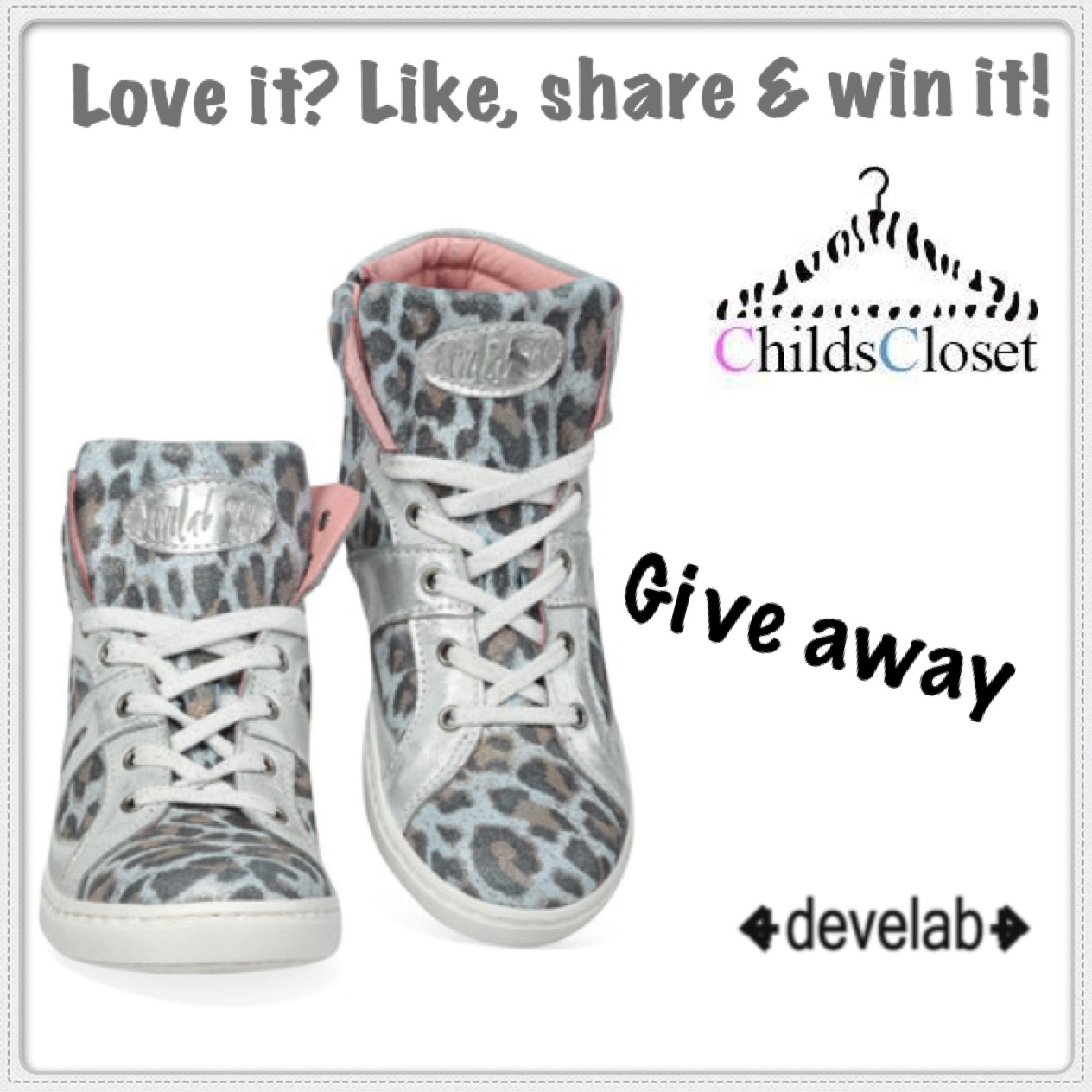 Zin in een give away? Wij wel! Dus geven wij deze stoere Develab sneakers weg. Kansmaken? Easy! Als je al vrienden bent met childscloset.nl/ hoef je alleen dit bericht te delen en niet vergeten de maat door te geven in een reactie. Nog geen vrienden met ChildsCloset? Like dan nog ook nog even onze pagina, om kans te maken op deze mooie schoentjes. Deze give away actie loopt tot en met zaterdag 12 december aanstaande. Succes!