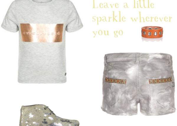 Sparkle wherever you go en hoe kan dit beter in een mix and match van zilver en brons tinten? De basis houden we grijs zodat het geen overkill wordt, genoeg om sprankelend voor de dag te komen. Een stoer outfitje voor sprankelende dametjes. Bomba shorts Maruti Gimlet Little Pieces teeCowboysbelt armband