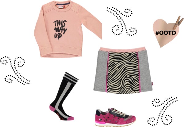 Sporty, vrolijk, roze niet te vergeten, en een furry zebra rok, wat wil een meisje nu nog meer? Het aan hebben! Je shopt deze look via onderstaande icoontjes. SneakersSweater RokKniekousen