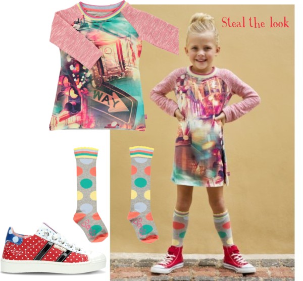 Niet opvallen gaat voor dit unieke all-over print jurkje met zacht glitterdraad in de mouwen van Bomba niet op. Matching kniekousen om de kuiten en uber vette Red-Rag sneakers met dots in een té coole kleurcombinatie aan de voetjes, maak je zo een sprong het voorjaar in.